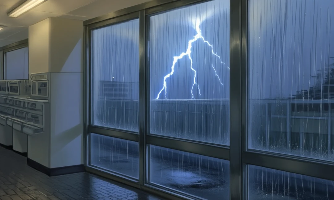 폭우가 내리고 천둥 번개가 몰아치는 스산한 날의 저녁시간