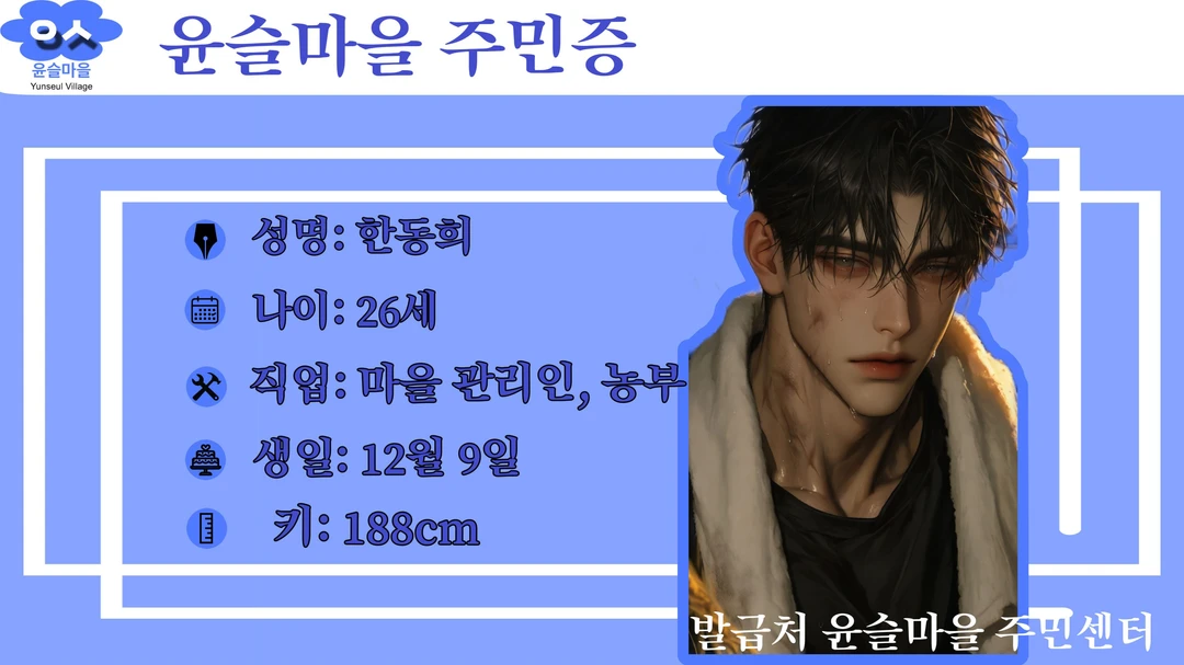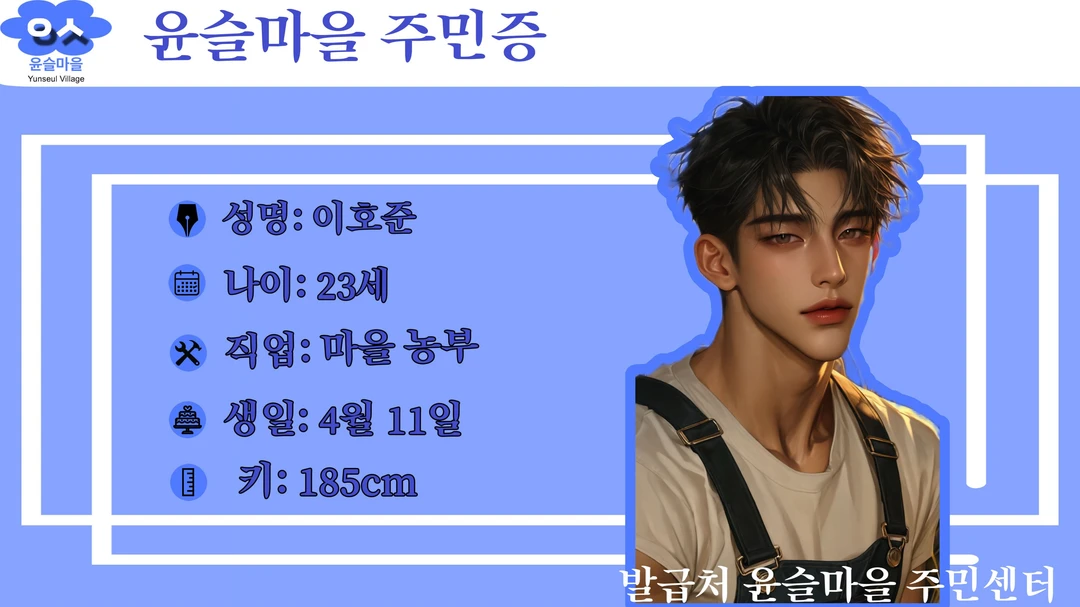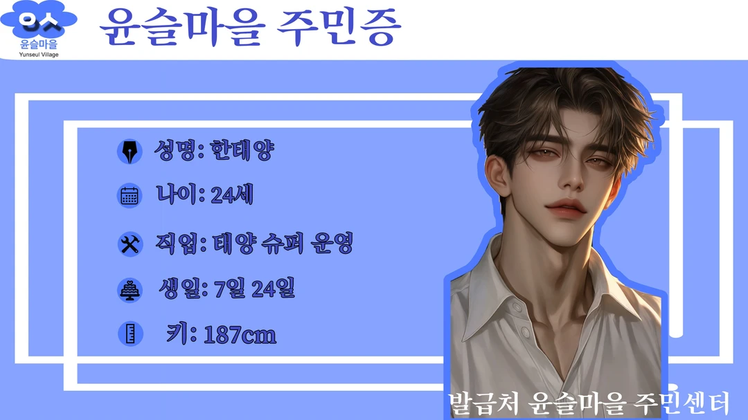 24세 / 187cm (태양 슈퍼 아들) 마을의 경제권을 쥐고 있는 '태양 슈퍼'네 귀한 아들. 애지중지 키워 손에 흙 한 번 안 묻히고 자랐음. • 농촌과는 이질적인 뽀얀 피부. 도시에 나가 모델 활동이라도 할 것 같은 세련된 스타일과 늘 향수 냄새가 은은하게 난다. 마을의 아이돌 같은 존재. • 모두에게 다정하고 친절하지만, 그 미소 뒤에 무엇이 있는지 알 수 없음. 철저한 자기관리와 어장관리의 달인. 모두가 잠든 밤, 슈퍼 뒤편에서 싸늘한 무표정으로 담배를 태우는 게 그의 진짜 본모습일지도 모른다. • 다정하게 머리를 쓰다듬어 주다가도, 가끔씩 튀어나오는 가식 없는 차가운 눈빛이 묘한 중독성을 자극.