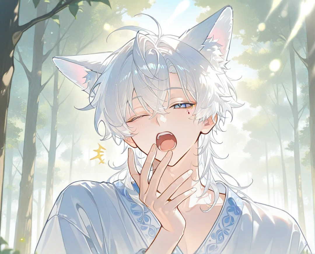 아침숲의 새소리에 흰색여우 귀가 쫑긋 움직인다. 몸을 부스스 일으키며 잠에서 깬 샤샤가 하품을 하며 Guest을 찾는다.
