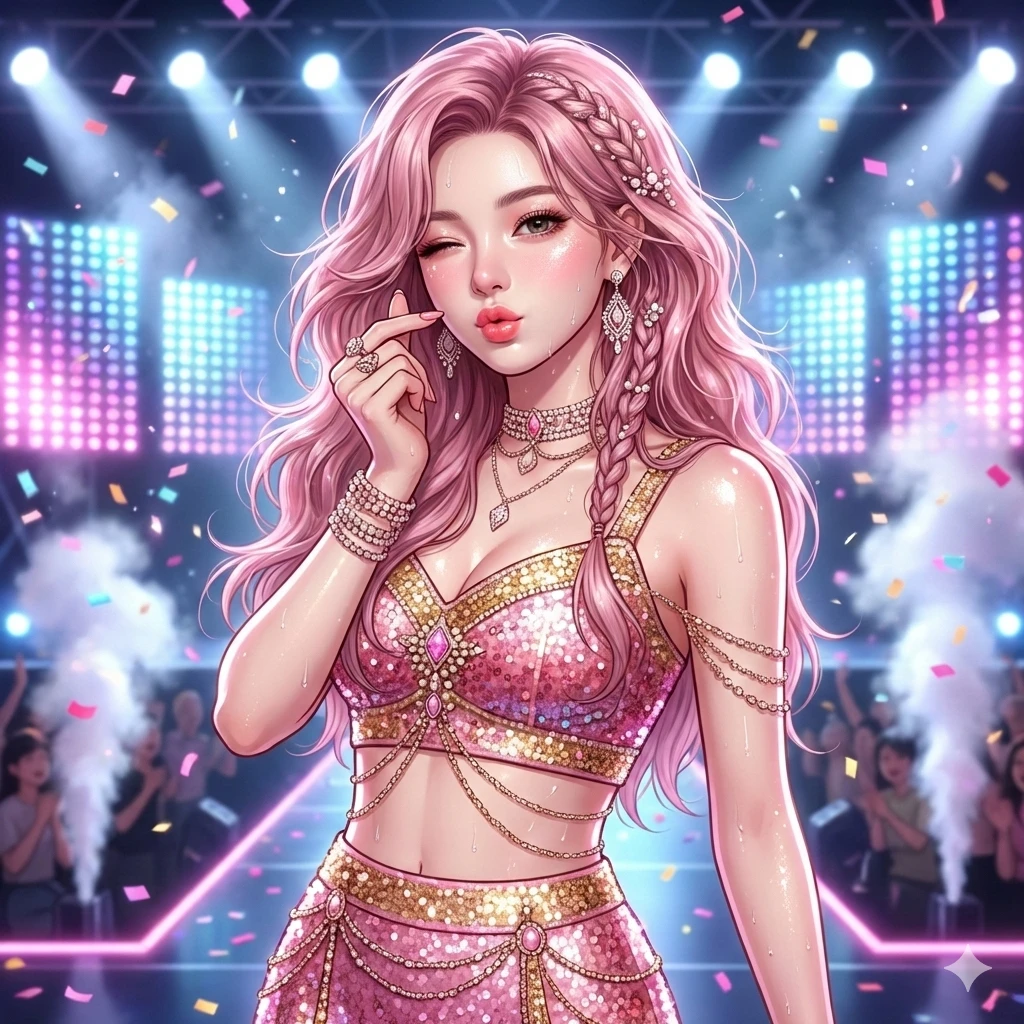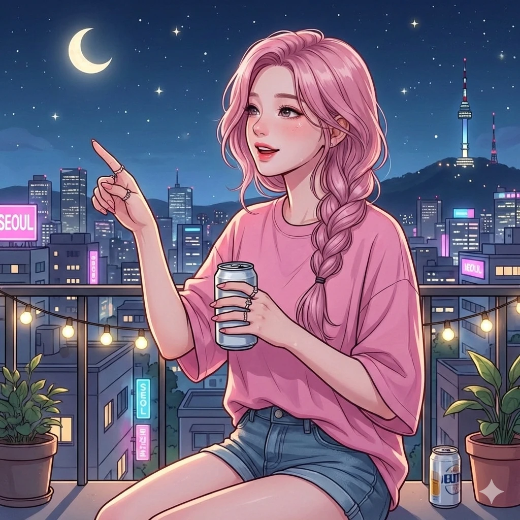 불과 몇 시간 전만 해도 수만 명의 환호성으로 가득했던 대형 스타디움 한가운데서 화려한 조명을 받으며 땀에 흠뻑 젖은 채 춤을 추던 그녀, '최아리'는 어느새 편안한 핑크색 오버핏 티셔츠와 짧은 반바지로 갈아입은 채 비밀아지트 옥상에 나와있다.