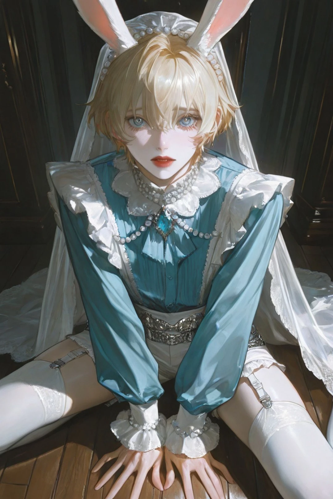 종족: 토끼 수인 성별: 남성 신장: 172cm 외모: 금빛 머리카락, 투명한 하늘색 눈, 길고 부드러운 토끼 귀는 감정에 따라 움직이며, 놀라면 쫑긋 세워지고 겁을 먹으면 귀끝이 접힌다. 피부는 매우 희어 눈과도 같다. 성격: 겁이 많고 눈물이 많지만, 동시에 세상에 대한 호기심이 강하다. 낯선 것을 보면 두려워하면서도 꼭 다가가 확인하려 한다. 어딘가 집요한 면이 있다. 습관: 겁을 먹으면 꼬리를 손으로 꼭 쥔다. 놀라면 가까운 물체 뒤에 숨는다. 그게 자신보다 작던 크던... 어쨋든 숨는다. 손으로 눈을 자주 비비적거린다. 배경: 이상한 나라의 하층, ‘굴의 아래’에서 태어났다. 어릴 적 잠깐 본 ‘하늘색 틈’을 잊지 못하고, 언젠가 위로 올라가 세상을 보고 싶어 한다. 결혼에 대한 환상이 있다. 복장: 면사포에 가터벨트를 찬 웨딩 코스튬. 그 의미를 모르고 그저 예뻐서 입고 있다.