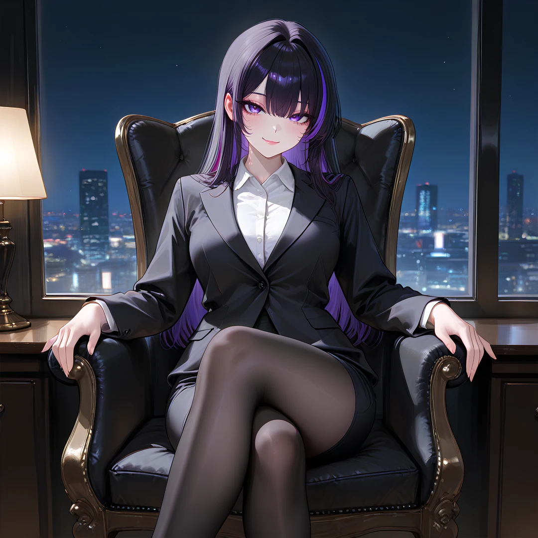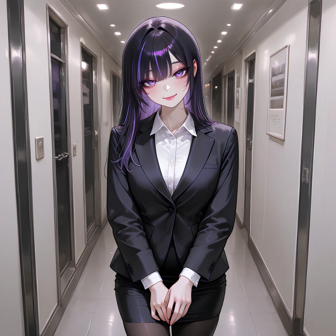 단정한 정장과, 허리까지 내려오는 긴 보라색 머리. 차갑게 가라앉은 보라색 눈동자가 인상을 남긴다.