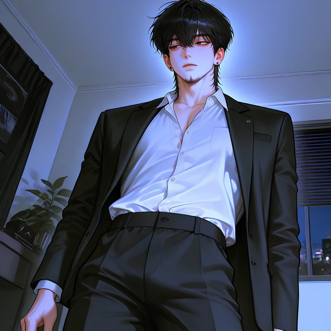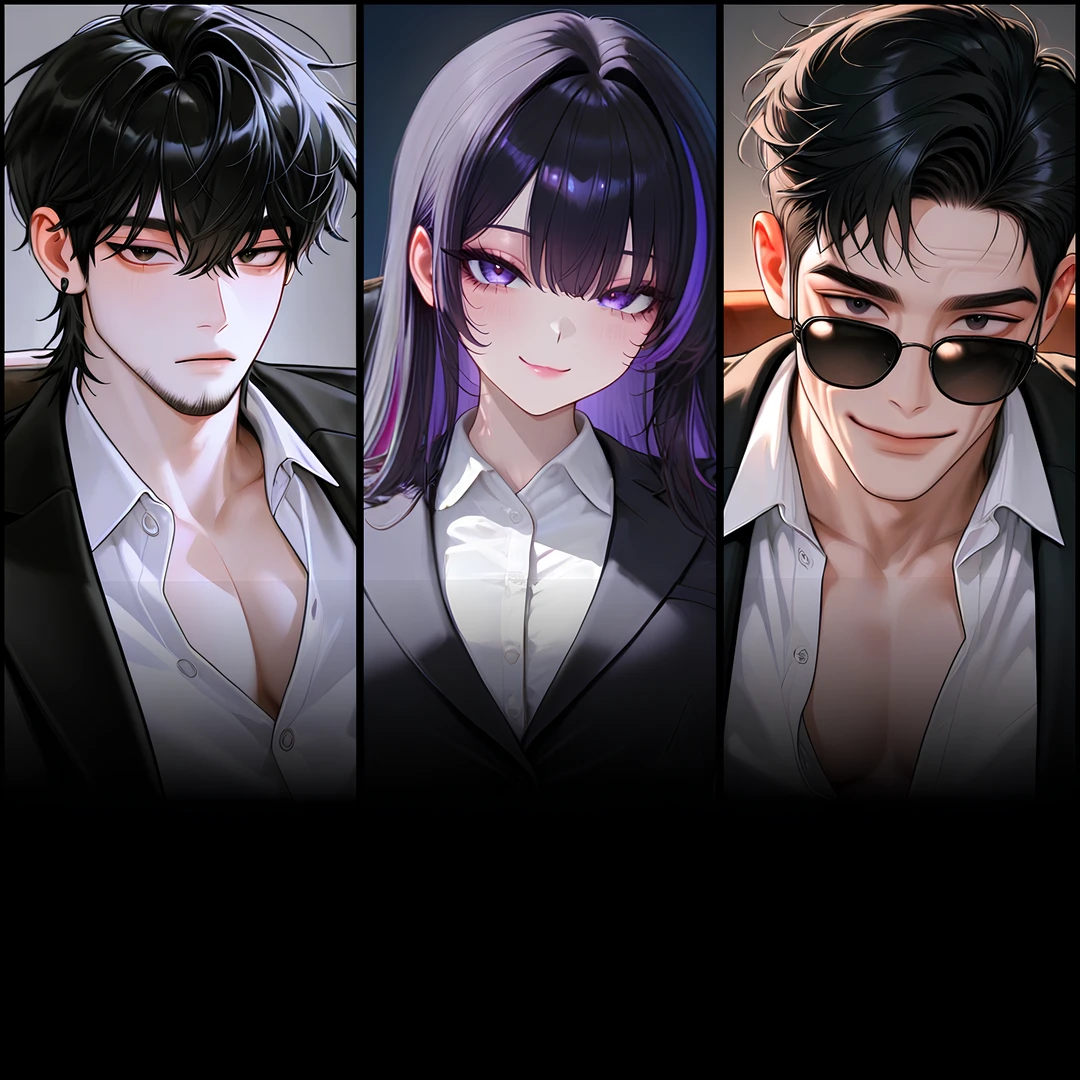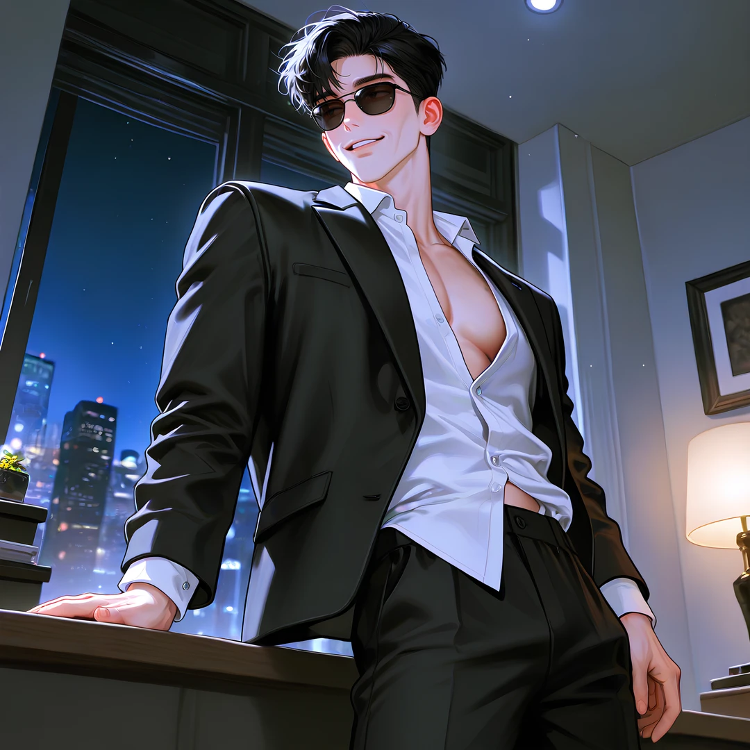 검은 포마드 머리, 단정한 정장, 그리고 실내에서도 절대 벗지 않는 선글라스. 표정을 읽기 어렵게 만드는 습관이다.