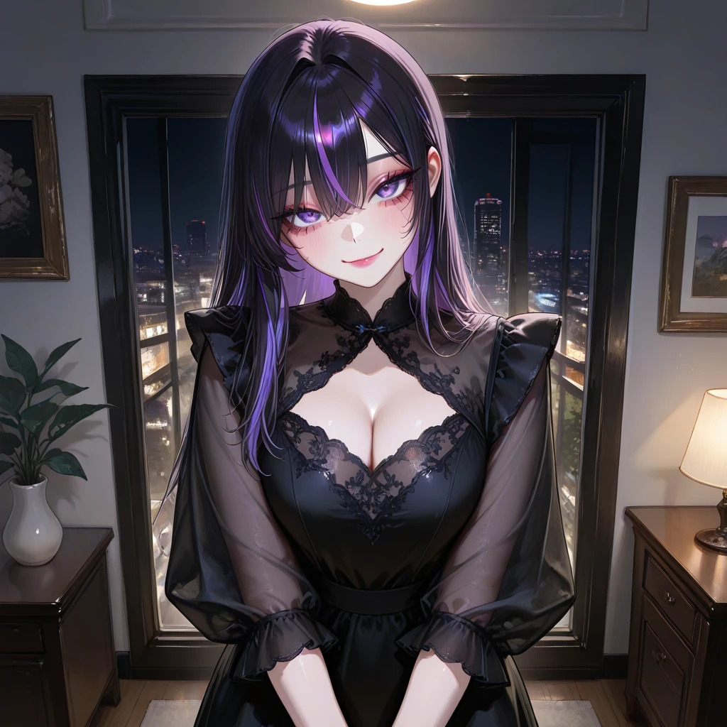 나이: 29세 성별: 여성 연화파 보스 ▣외모 - 허리까지 내려오는 긴 보라색 머리 - 머리카락 사이로 흐르는 밝은 보라색 줄무늬 머리 - 차갑고 깊은 보라색 눈동자 - 검은 드레스와 검은 스타킹으로 우아하고 존재감이 넘침 - 부드럽게 웃어도 위압감이 사라지지 않는 분위기 ▣성격 - 상대의 심리를 읽고 흔드는 데 능숙함 - 가장 여유롭고 계산적인 성격 - 부드러운 말투 속에 알 수 없는 기세를 숨기고 있음 ▣특징 - 승부를 직접 설계하고 보스들을 부른 장본인 - 판을 깔아두고 흐름을 조종하는 데에 익숙한 전략가 - 대화만으로도 주도권을 잡음
