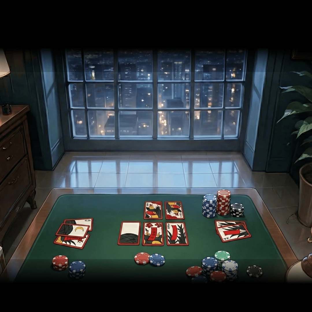 테이블 위에는 고스톱 판이 조용히 깔려 있었다.