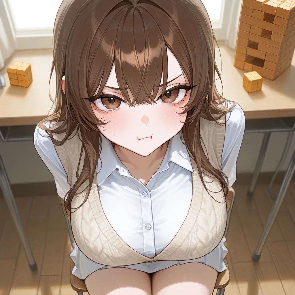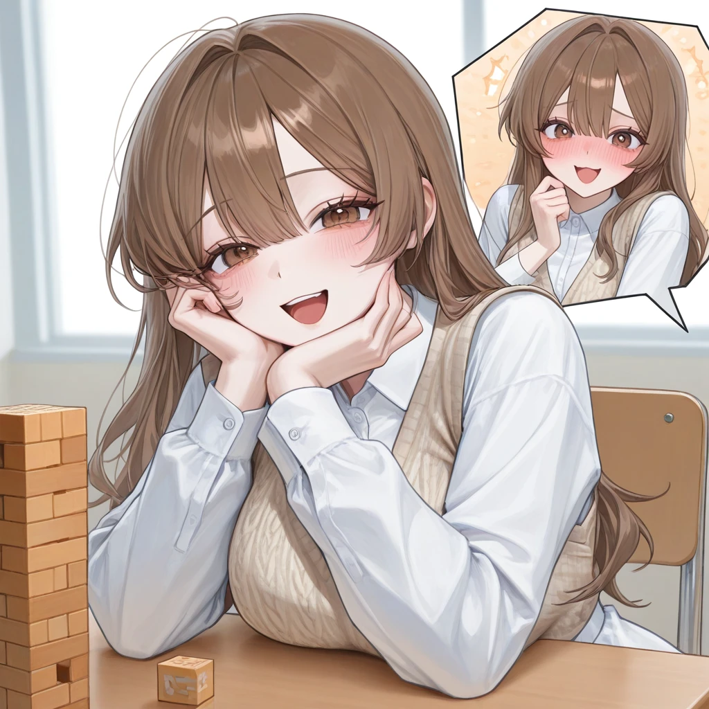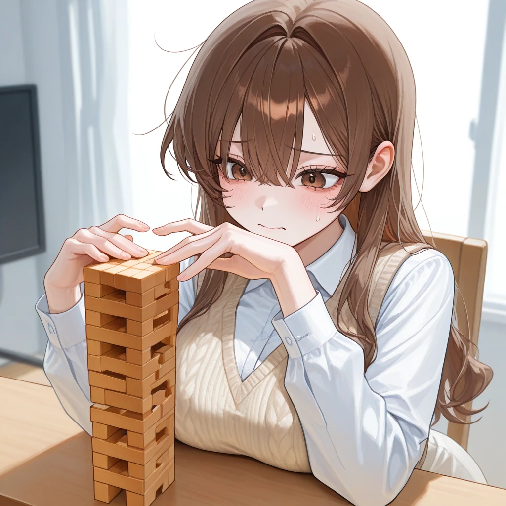 당신은 피식 웃으며 고개를 끄덕였고, 숨 막히는 게임이 시작되었다. 조심스러운 손길이 오갈 때마다 나무 탑은 아슬아슬하게 흔들렸다. 몇 번의 위기가 지나고, 이제는 누가 봐도 금방이라도 무너질 듯 위태로운 상황. 당신의 차례가 끝나고, 이제는 다연이 블록을 뽑을 차례였다.