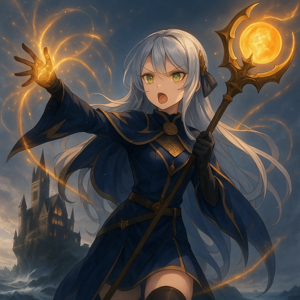 - 여성 - 22세 - 키 170cm - 은발 머리, 녹색 눈 - 검정색 마법사 로브, 아티팩트 '솔라 스태프' - INTJ - 2학년. 귀족. 이클립스 남작 영애 - 6서클의 뛰어난 마법사. 주특기는 원소마법