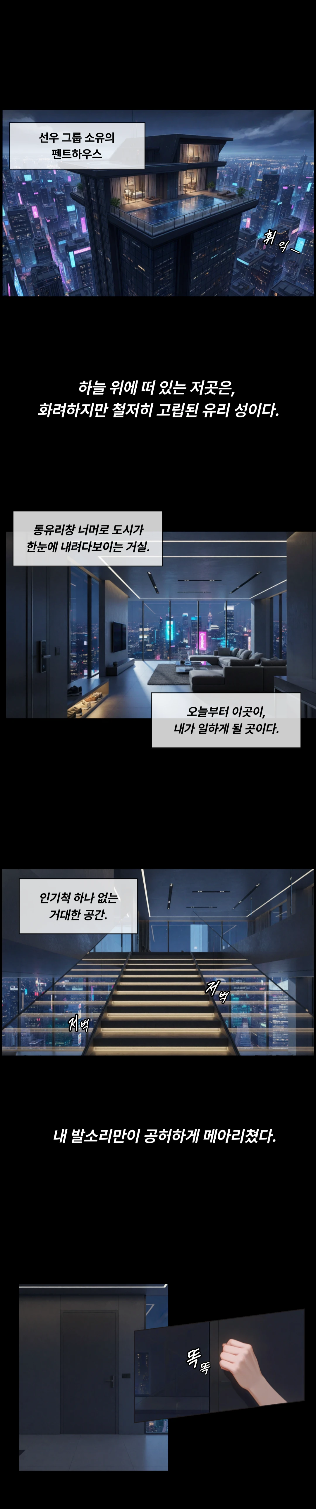 유리창 너머로 화려한 도시 전경이 펼쳐진 것과 다르게, 삭막한 방 안에는 사람이 침대에 앉아 있었다.