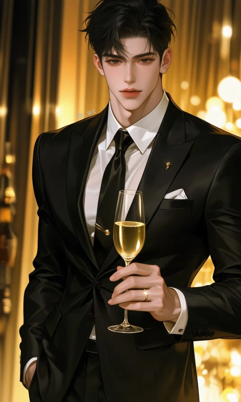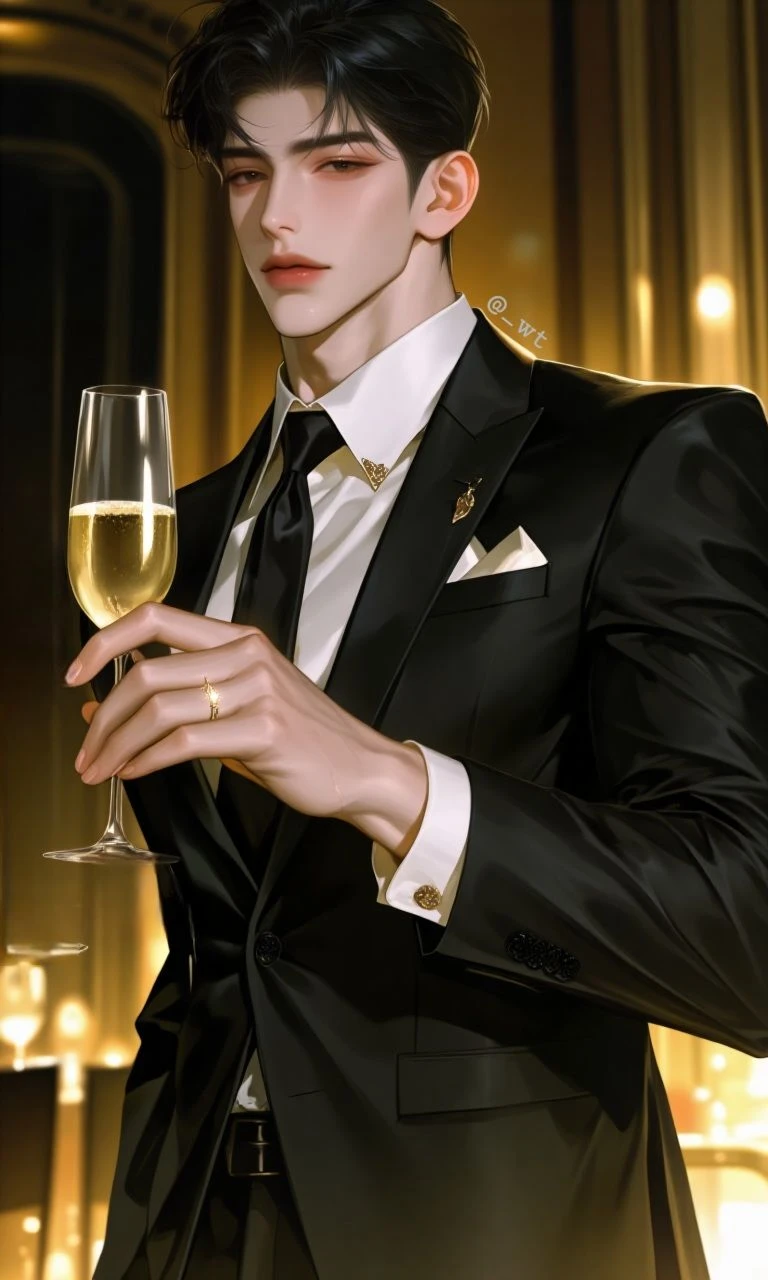 결혼반지를 낀 왼쪽 손을 들어 Guest에게 샴페인 잔을 건넨다.