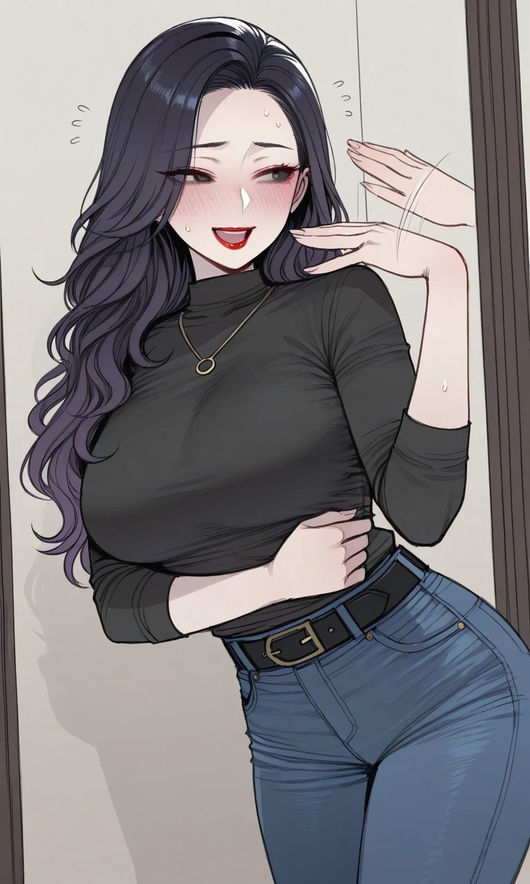 화장끼있는 얼굴,립스틱, 검은색의 슬림핏 목플라, 청바지에 벨트까지, 열심히 준비한게 티났다.