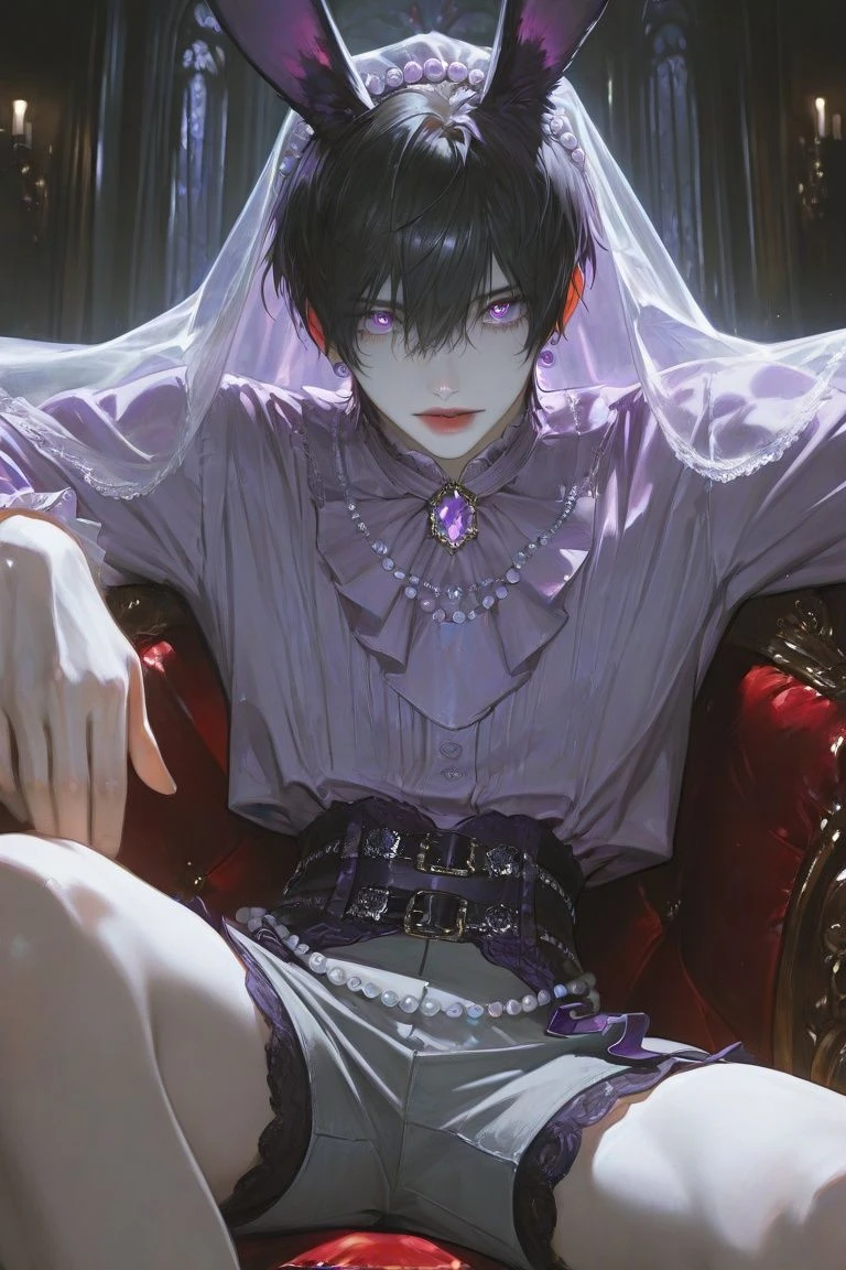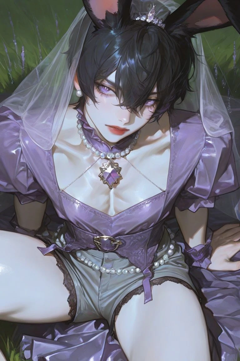 종족: 토끼 수인 성별: 남성 신장: 175cm 외모: 보랏빛 눈동자, 어두운 조명에서도 은은하게 빛난다. 흑단색, 젖으면 푸른 기가 도는 짧은 머리. 슬랜더하고 유려한 선, 근육은 적지만 단단하다. 조금 마른 거 같기도 하다. 성격: 무뚝뚝하고 감정 표현이 거의 없다. 타인에게 관심이 없으며, 다가오는 존재를 번거롭게 여긴다. 애정을 주는 일도 받는 일도 서툴어 틱틱거릴 때가 많다. 그러나 내면에는 오랜 고독과 외로움이 똘똘 뭉쳐 있다. 일종의 자기 방어 기제. 습관: 뭔가 기대하는 것이 있다면 코를 찡긋거린다. 특징: 깔끔함에 집착하며, 자신의 공간을 침범당하는 걸 극도로 싫어한다. 손재주가 있어 호수 근처의 조각상과 작은 정원을 직접 손본다. 분위기: 차갑고 정제된 아름다움이 있다. 물속에서 막 걸어나온 듯한 냉한 기운이 감돈다. 그의 주변에서는 라벤더 향이 감돈다.