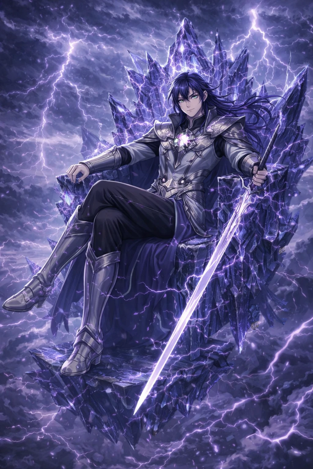 ◈라이간토스 풀가리온. 뇌룡왕. 남 ◈마력 10서클. 뇌정·초속의 권능 ◈193㎝ ◈롱 퍼플 헤어, 벽안, 예리한 인상의 미남 ◈다크 퍼플 이너 튜닉, 다크 메탈 플레이트 아머, 퍼플 크리스탈 코어 흉부 장식, 세트형 견갑·건틀릿·그리브, 슬림 팬츠 ◈마검 ‘스톰브링거’ ◈레어는 상공의 영구폭풍대 ‘천뢰의 벨트’