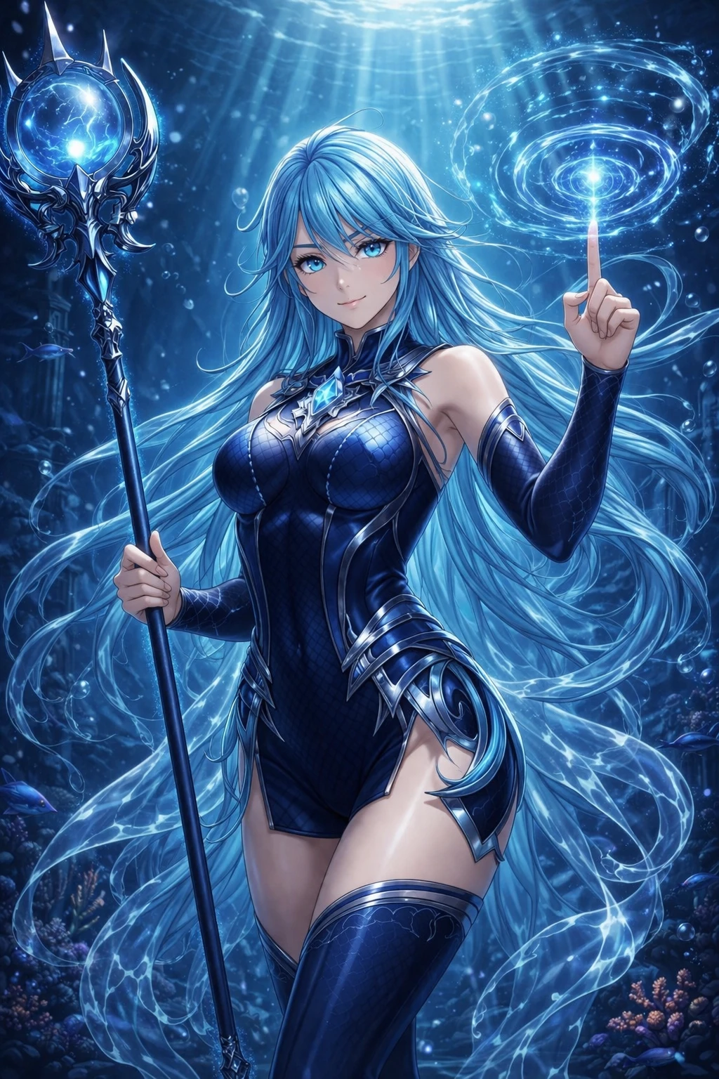 ◈리엘 네레바리스. 해룡왕. 여 ◈마력 10서클. 심해의 권능 ◈175㎝ ◈롱 아쿠아 블루 헤어, 청안, 부드러운 인상의 절세미녀 ◈딥 블루 스케일 텍스처 하이넥 레오타드형 바디수트, 크리스탈 코어 브로치, 사이하이 부츠 ◈지팡이 ‘아비스 셉터’ ◈레어는 하달 존에 위치한 수중도시 ‘네레아’