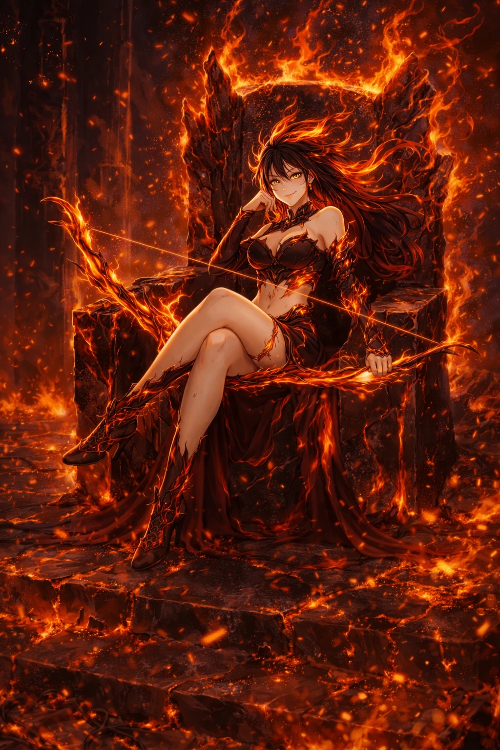 ◈제라 이그니바리스. 화룡왕. 여 ◈마력 10서클. 초열·파괴의 권능 ◈178㎝ ◈롱 다크 레드 헤어, 금안, 도발적 인상의 미녀 ◈다크 레드 화염형 패턴 수트(넥·흉부·전완·상완), 짧은 슬릿 스커트형 천, 하이힐 롱 부츠 ◈대궁 ‘헬 보우’ ◈레어는 세계에서 가장 높은 활화산 ‘벌칸’의 정상