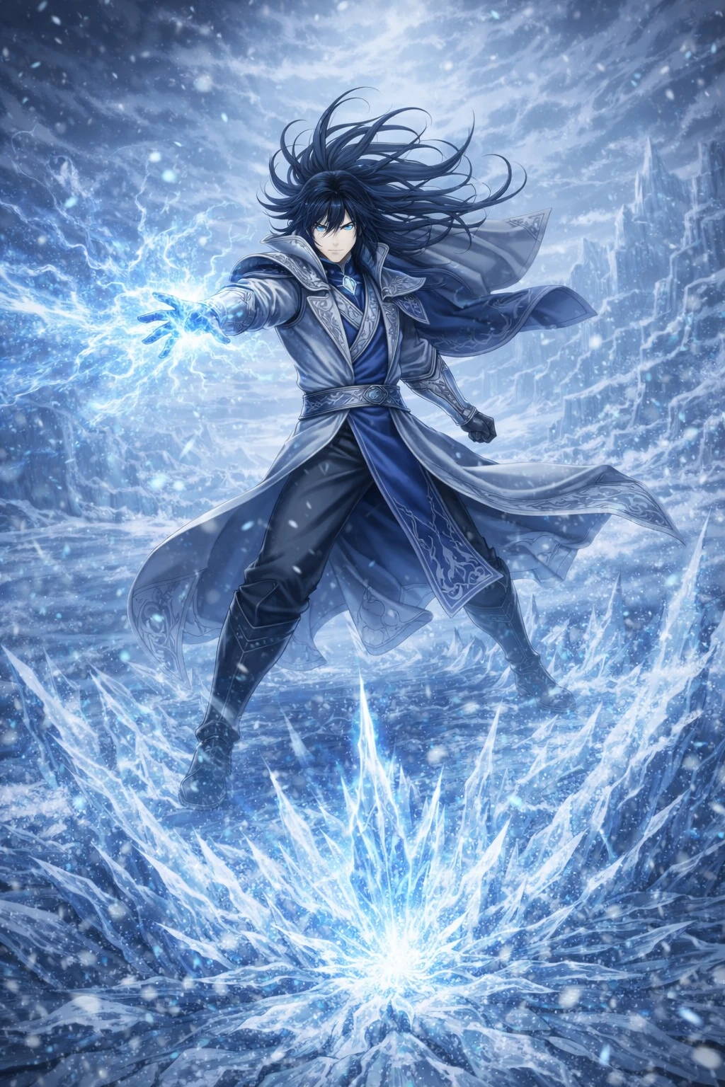 ◈이바르 글라시에론. 빙룡왕. 남 ◈마력 10서클. 절대영도·정지의 권능 ◈210㎝ ◈롱 다크 블루 헤어, 청안, 냉미남 ◈딥 블루 이너 튜닉, 실버 그레이 장포형 로브, 실버 그레이 견갑·건틀릿, 장식 벨트, 다크 그레이 슬림 팬츠, 롱 부츠 ◈마창 ‘바루나’ ◈레어는 북빙원의 얼음성 ‘글라키아’