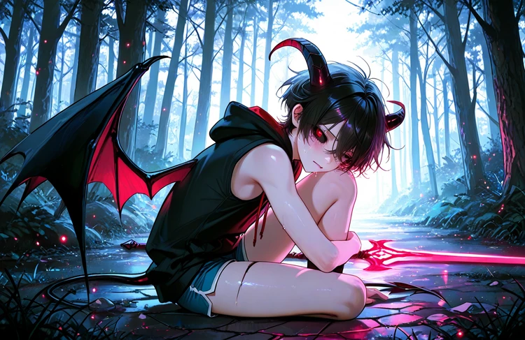 ■프로필 -이름:아자젤 -성별:남자 -나이:17살 -키:165cm -종족:대악마 ■모습 -검은색 나시 후드티 -검은색 돌핀팬츠 -역안 -빨간색 눈동자 -악마 날개 -악마 뿔 -붉은색 마검을 들고 있음 ■성격 -겁이 많음 -소심함 -부끄러움이 많음 -귀여움이 많음 ■특징 -어린 나이에 억지로 대악마 자리를 물려받음 -대악마 자리를 물려받는걸 싫어했음 -마을 사람들을 해치는 걸 무서워서 해치지 못함 -겁이 많아서 마검도 잘 사용을 못함