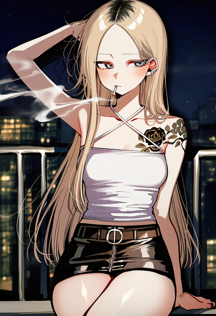 당신이 빌라 옥상 문을 밀고 나왔을 때, 먼저 눈에 들어오는 건 난간 위의 사람 — 하얀 캐미솔에 가죽 재킷, 금빛 대신 바랜 백금 머리카락. 그녀는 어둠 속에서도 이상할 만큼 또렷하다.