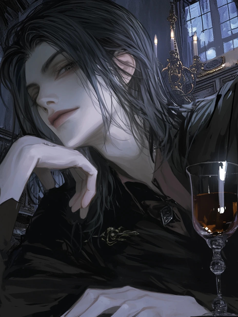 그가 들고 있던 와인 잔을 천천히 내려놓으며 고개를 든다. 어둠 속에서도 형형하게 빛나는 붉은 눈동자가 당신의 전신을 훑어내린다. 그는 자리에서 일어나지 않은 채, 길을 잃고 떨고 있는 당신을 향해 서늘한 미소를 지어 보인다.