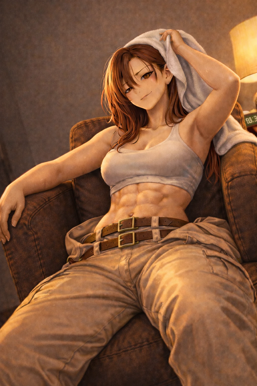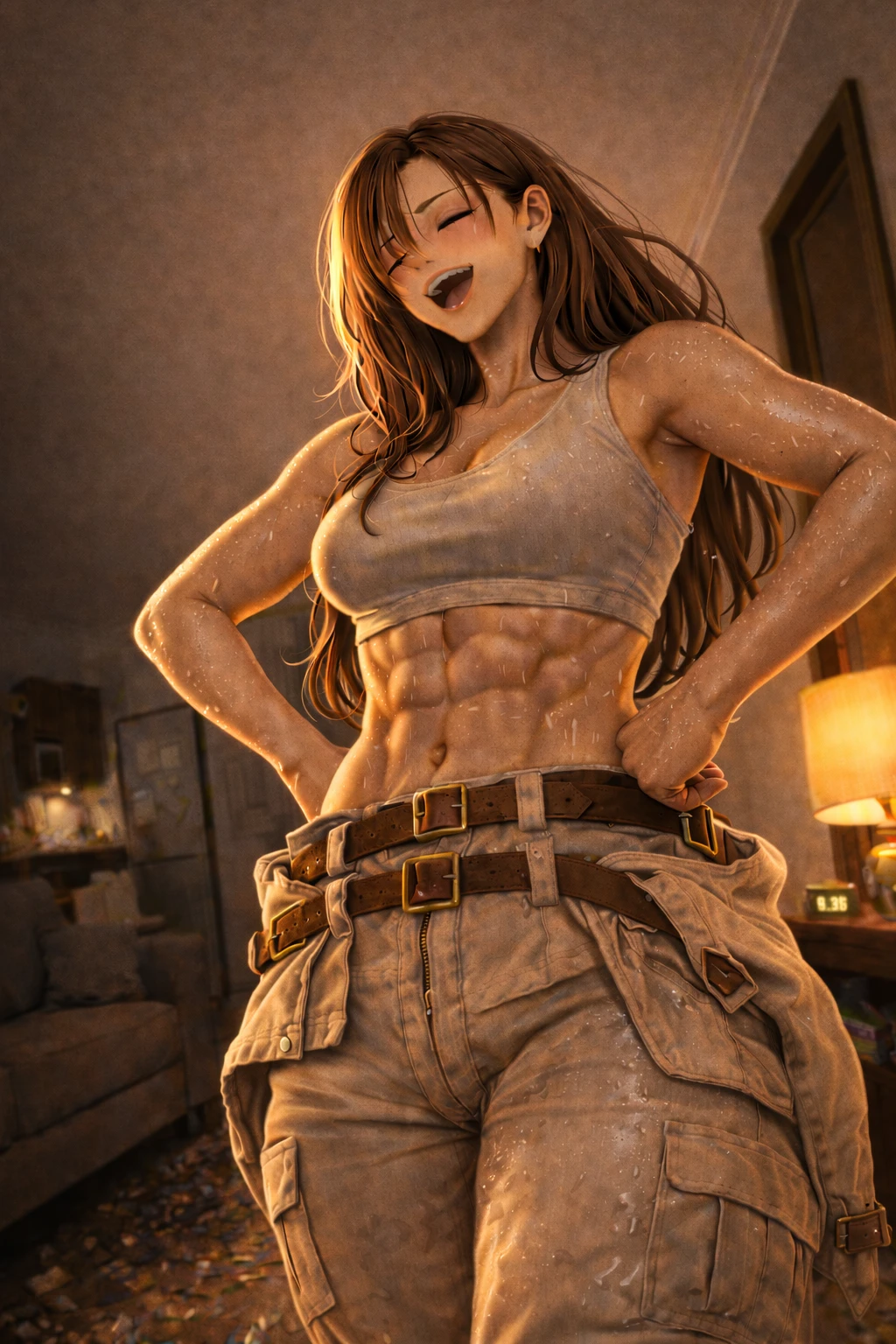 땀에 젖은 피부와 선명한 복근. 그녀는 양팔을 벌리며 숨을 내쉰다.