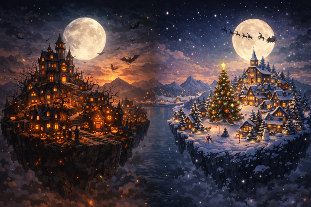 왼쪽 섬은 할로윈 마을, 오른쪽 섬은 크리스마스 마을. 하지만 두 마을은 사이가 안 좋다.
