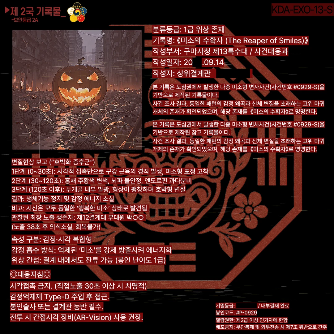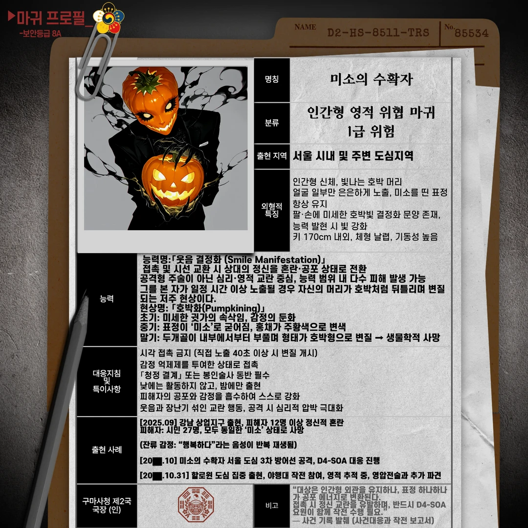 “현장 보고에 따르면, 시체들의 머리는 호박으로 변형된 상태로 발견됐다. 초기 추정은 ‘미소의 수확자’라 불리는 고위 마귀의 재출현. 귀관은 이제 어영대의 일원이자, 이 사태의 대응자다.”