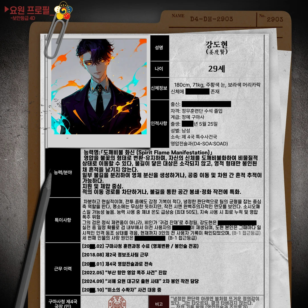 보조 구마사 강도현 (Callsign: “Ember”) 도깨비불 화신 능력자. 봉인술 및 공간 정화 특화. 현장에서는 통제자 역할을 맡는다. (비고: 감정 억제형, 지휘 판단 우수.)