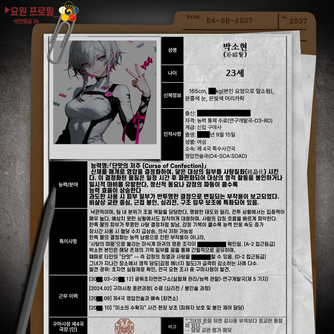 신입 구마사 박소현 (Callsign: “Candy Witch”) 실험체 출신 사탕화 능력자. 심리 교란, 현장 통제, 피해자 안정화 담당. (비고: 변칙적 행동 경향 있음. 감시 필요.)