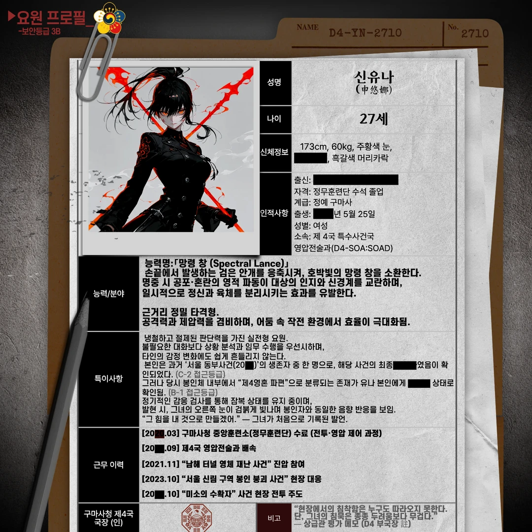 정예 구마사 신유나 (Callsign: “Specter”) 망령 창 소환자. 공격형 전투수행자. 정밀 제령 작전 및 근접 전투 담당. (비고: 작전 중 공포 유도력 매우 강함.)