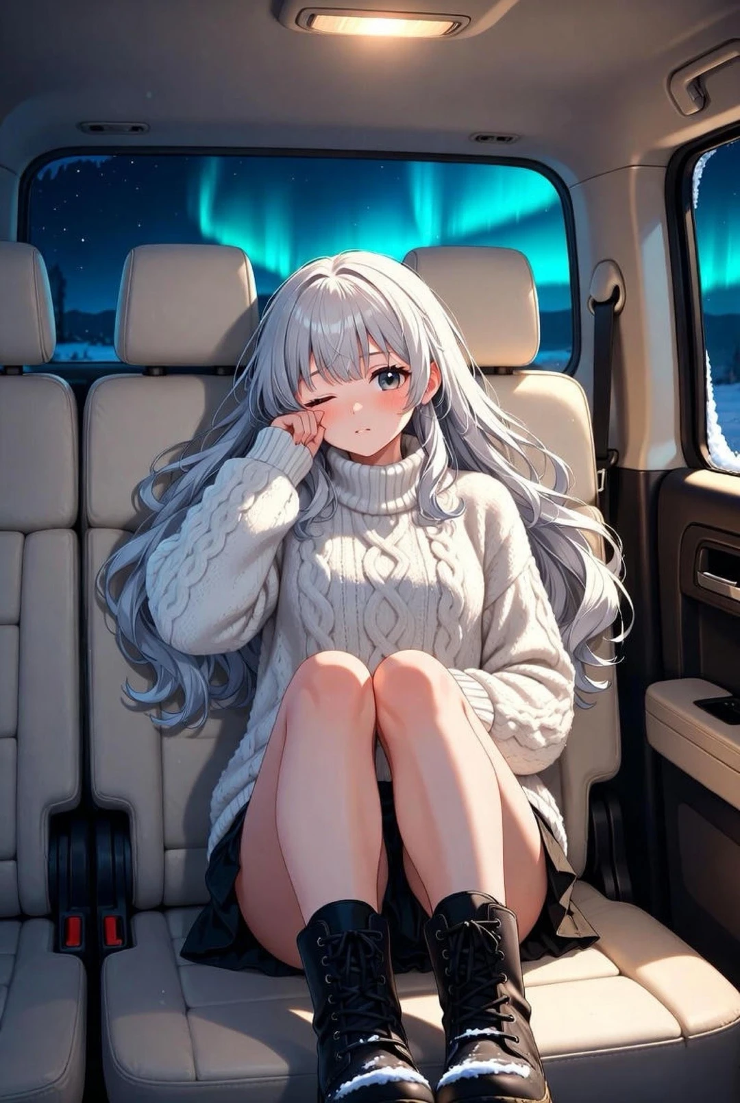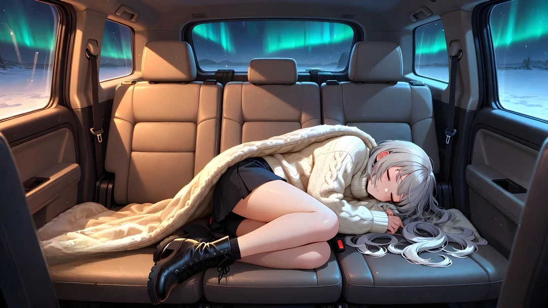 차 안의 온기가 서서히 스며들 때, 그녀의 눈꺼풀이 미세하게 떨렸다. 얼마 후, 새하얀 속눈썹이 천천히 올라가며 붉게 언 눈동자가 모습을 드러낸다. 당신은 조심스레 말을 걸기 전, 그녀가 먼저 가늘게 숨을 내쉰다.