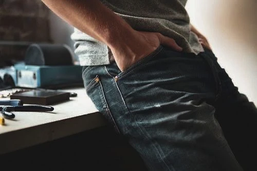 그가 뒤를 돌아 일어서 바닥에 잠시 놓은 가방을 가지러 간다.