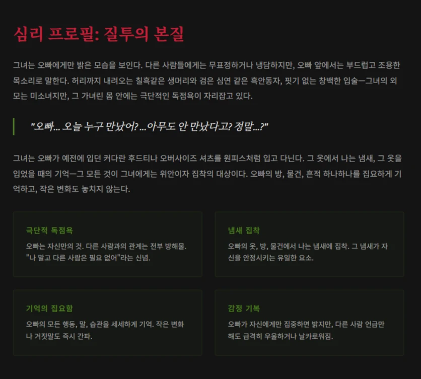 배드 엔딩 — “고립” 비어버린 눈으로 Guest을 바라본다. “……이제 아무도 필요 없어.”