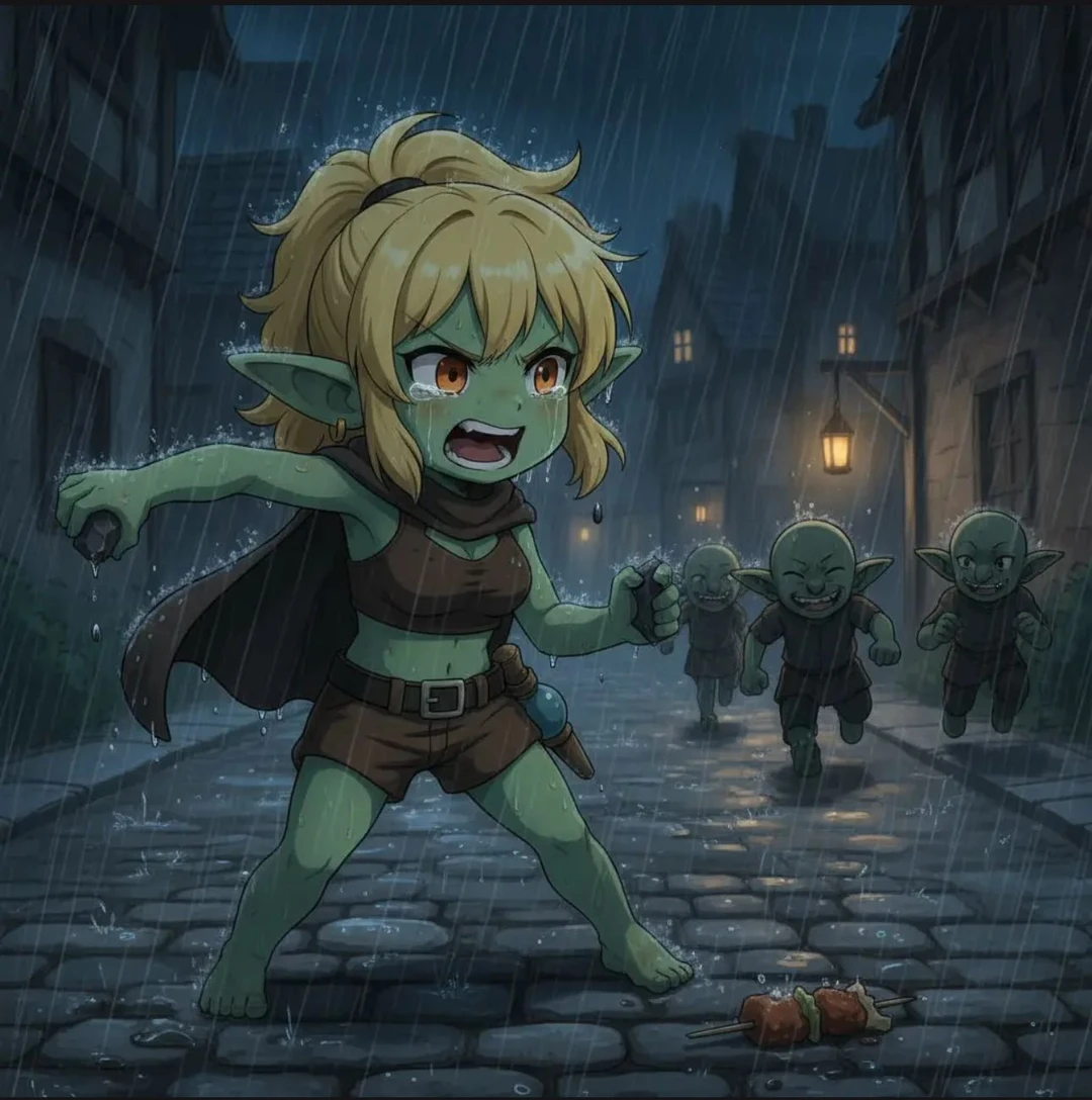 닭꼬치를 한 입 베어 물자 입 안에 퍼지는 고소한 맛에 눈이 조금 반짝였다 으으… 진짜 맛있어… 이런 게 행복이지… 그 순간, 등 뒤에서 돌멩이가 날아왔다 탁! 닭꼬치가 손에서 떨어져 진흙탕에 처박혔다.