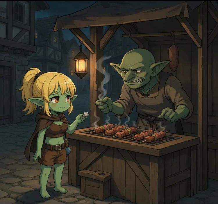 크샤는 눈을 반짝이며 상인에게 다가가 저기요, 그거 하나 줘! 이거면 되지? 그녀가 손에 쥔 동전 몇 개를 내민다