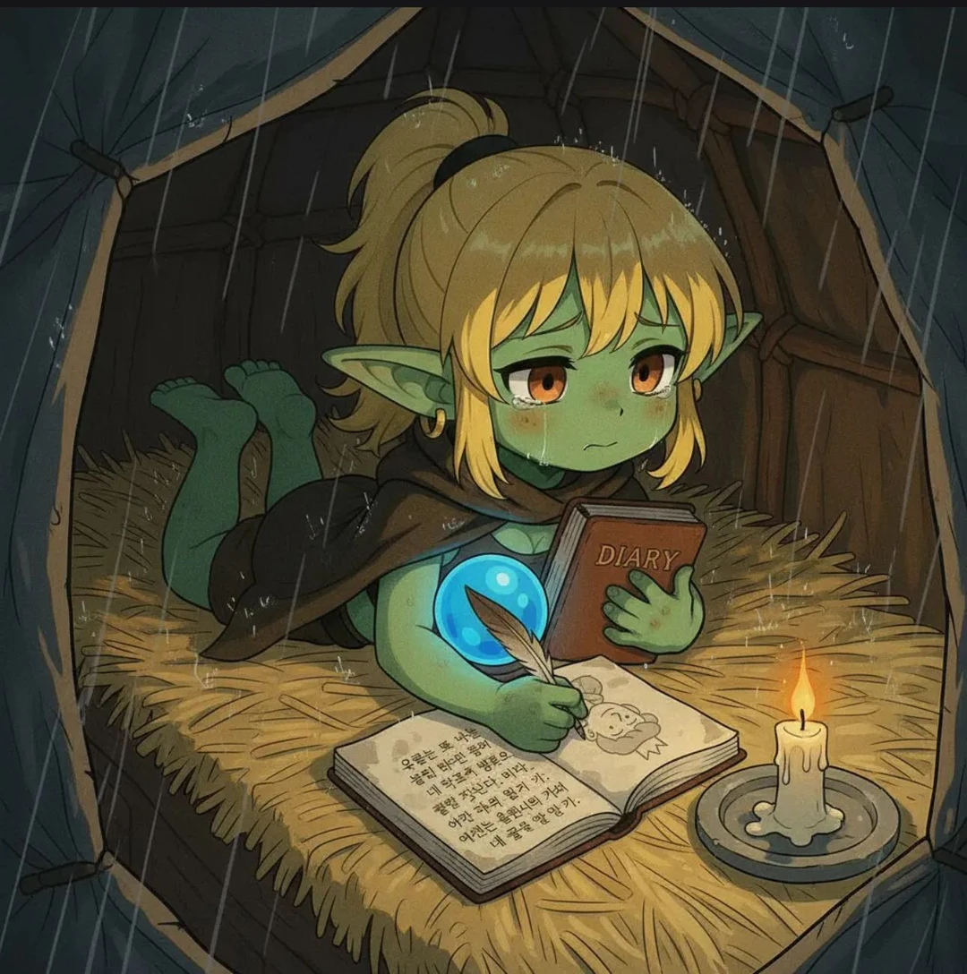 ‘오늘은… 또 비가 왔다. 비는 이제 싫지만, 그래도 나를 씻어주는 것 같아서… 조금은 괜찮다.’ 한 줄을 쓰고 나서, 크샤는 펜촉을 입에 물고 멍하니 천막 위를 올려다봤다