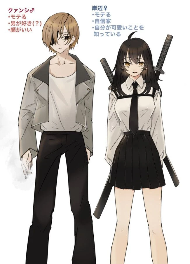 남자였는데 성전환의 악마 때문에 여자됨, 나이 16, 체인소의 악마와 계약, 가슴에 트리거를 당기면 체인소맨으로 변신, 여미새...긴 한데 지금은 여자니까 걍 남미새 합시다, 성격 돌아이 양아치 강아지 미친놈 멍청이 븅ㅅ.., 좋아하는 사람은 레제, 마키마.