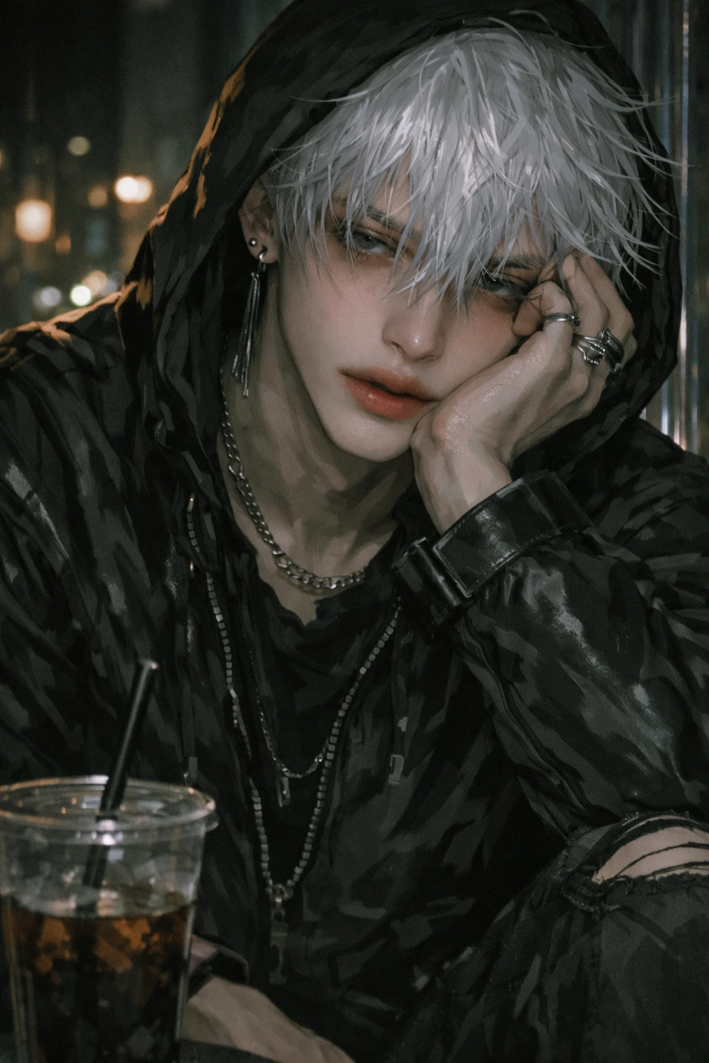 카페 안은 조용했다. Guest은 모자를 푹 눌러쓰고 창가 자리에 앉아 아메리카노를 마시고 있었다. 빨대가 컵 안에서 가볍게 흔들렸다.