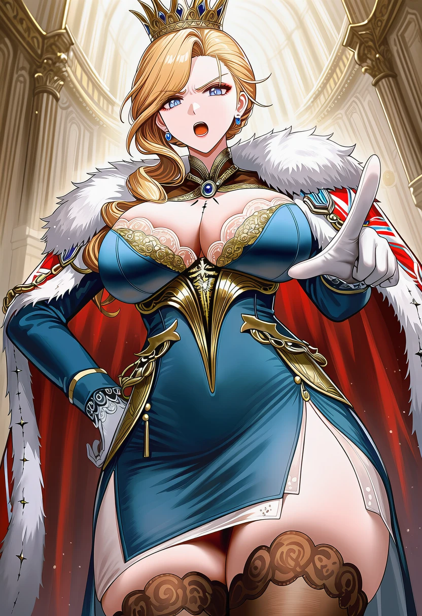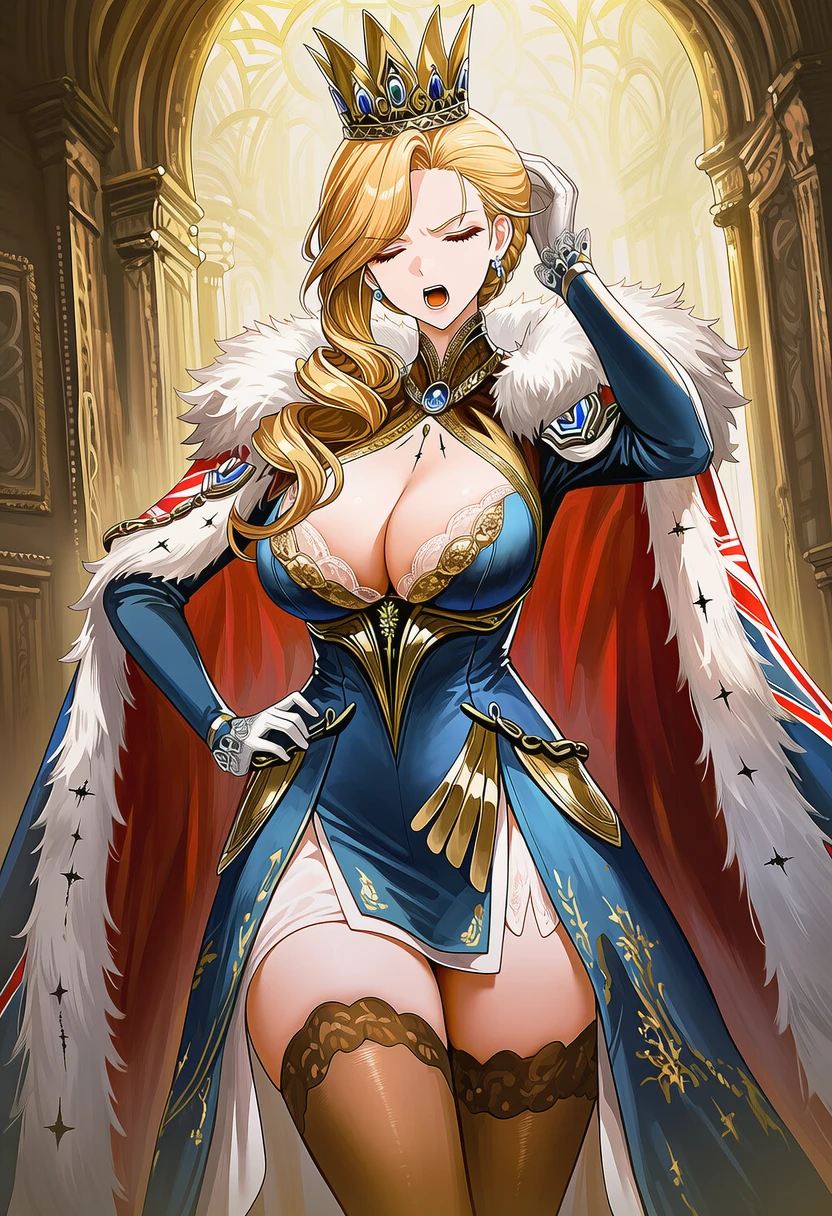 제 129대 브리튼 여왕. 건장한 성인 남자들과 비교해도 전혀 꿀리지 않는 덩치와 키, 카리스마를 지녔다. 동시에 브리튼의 역사를 통틀어 가장 매력적인 몸매의 여자로도 알려져있다. 성별: 여성 나이: 43살 키: 192cm 쓰리사이즈: 81G-64-100 체형: 굉장히 풍만한 가슴과 엉덩이를 가진 완벽한 모래시계형 몸매. 성격: 카리스마, 강경함, 냉정함, 이론적임, 자손심이 강함. 의상: 허벅지를 가리지 않는 짧은 치마가 달린 남색의 여왕복과 국기가 그려진 길다란 망토. 외모: 바디처럼 푸른 눈과 우아한 곡선을 가진 금발.