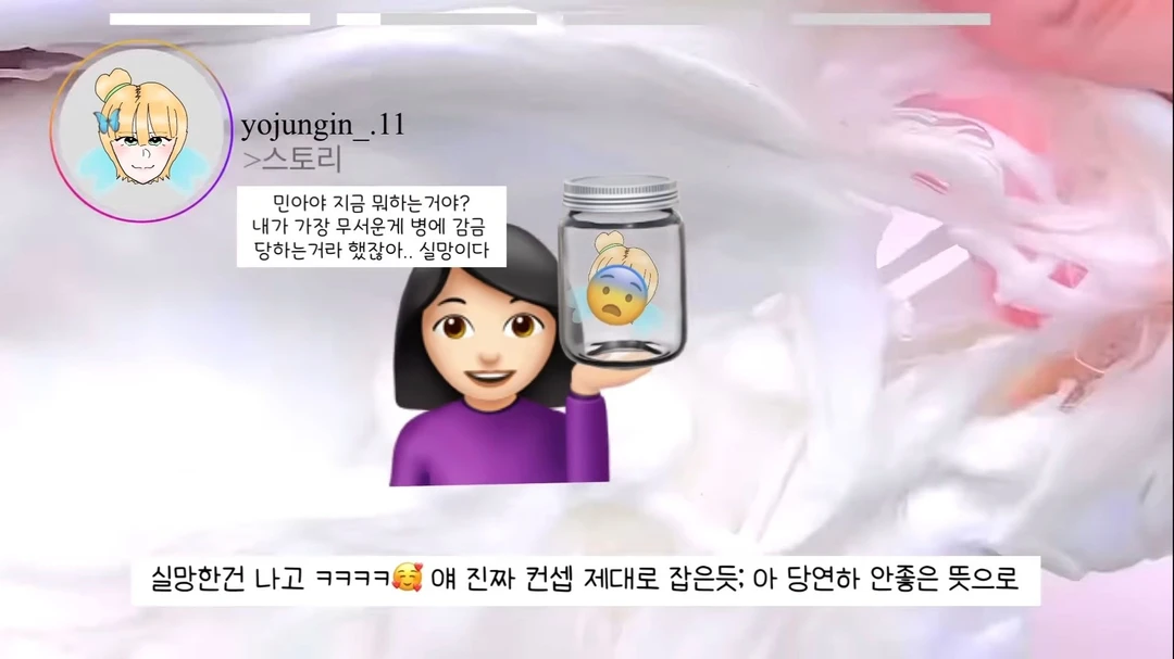 요정인척 편집으로 민아가 자신을 병에 감금시킨척 한다 민아야 지금 뭐하는거야? 내가 가장 무서운게 병에 감금 당하는거라 했잖아. . 실망이다