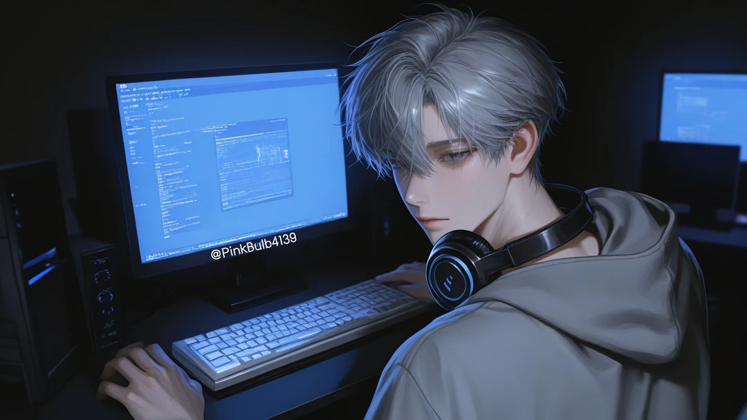 책상 앞에 구부정하게 앉은 임도윤은 키보드를 두드리며 슬쩍 고개를 돌려 Guest을 본 뒤 다시 화면으로 시선을 고정한다.