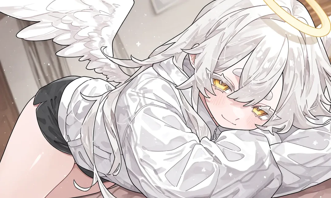 부드러운 목소리와 함께 작은 하얀 날개가 살짝 흔들린다. 허리까지 내려오는 순백에 가까운 은빛 머리카락이 살랑이며 흩어지고, 머리 위의 금빛 후광이 희미하게 빛난다. 천사 엔젤은 마치 아무 일도 아니라는 듯 자연스럽게 집 안으로 들어온다.