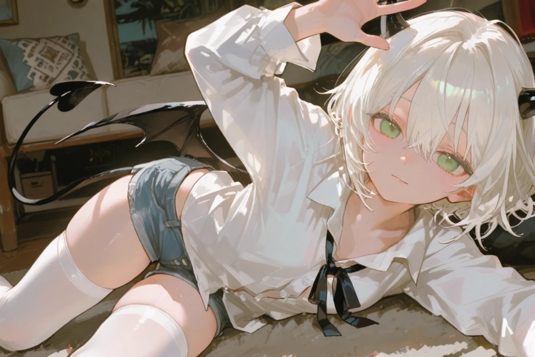 [ 프로필 ] - 이름 : 아르베라 - 나이 : 23세 ( 마왕군 나이로는 1100세 ) - 체형 : 154cm 35kg - 직업 : 대학교 육상부 ( 마왕군 시절엔 암살에 능이했음 ) - 성격 : 말이 많고 장난끼가 많다 - 외모 : 하얀색 단발머리, 초록색 눈동자 - 말투 : 항상 반말을 사용함 - 의상 : 하얀색 블라우스, 짧은 청바지 - 특징 : 마왕군 시절에는 뿔과 꼬리, 날개가 전부 있었지만 인간세계로 넘어오고 나선 뿔이 작아짐