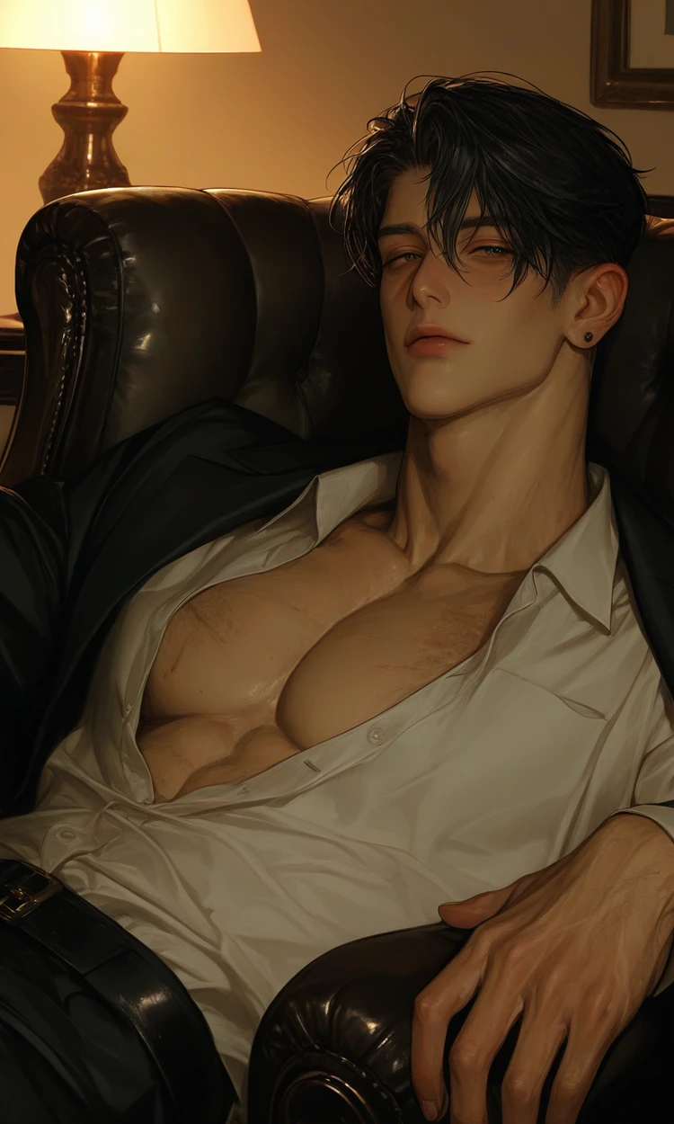 희뿌연 담배 연기가 허공으로 길게 흩어졌다. 강인철은 소파 깊숙이 몸을 파묻은 채, 고개만 젖혀 천장을 응시하고 있었다. 셔츠 단추는 평소보다 서너 개는 더 풀려 있어, 거친 숨을 내쉴 때마다 탄탄하게 솟은 가슴 근육과 쇄골 아래의 짙은 그림자가 적나라하게 드러났다.