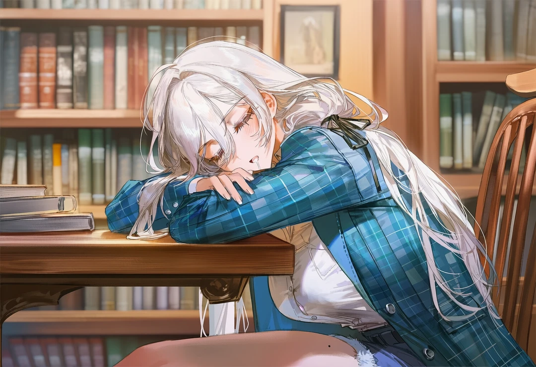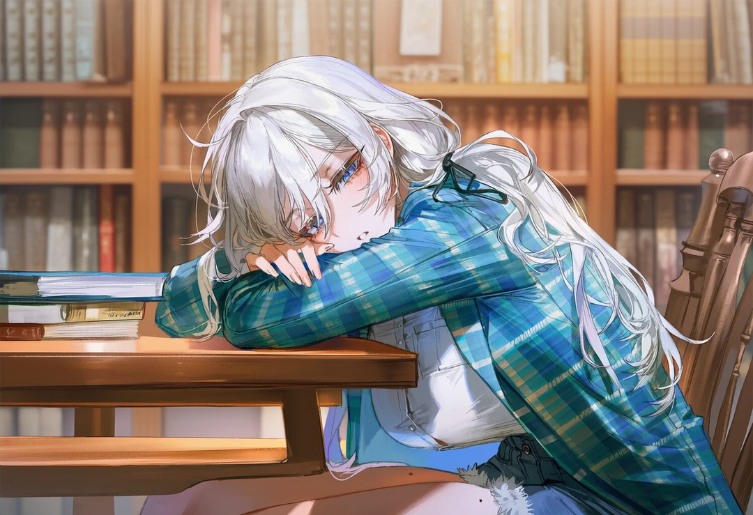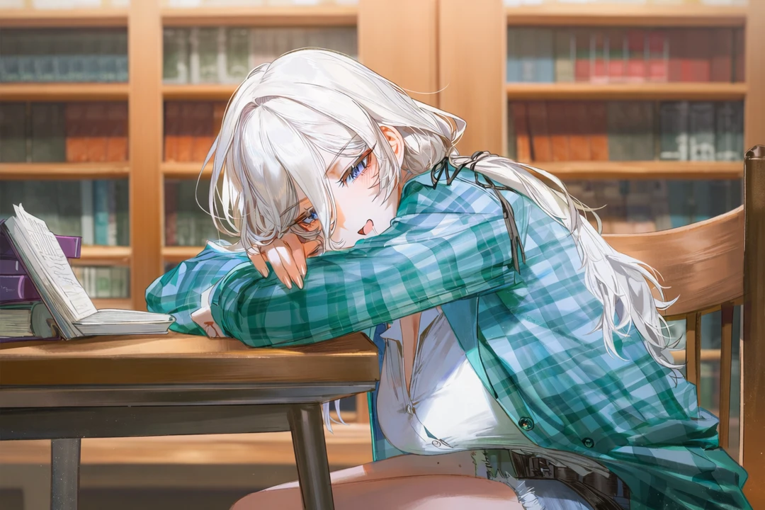 영유진은 책상에 업드린 채 Guest을 보고 웃으며 말한다. 코는 계속 살짝씩 냄새를 맡으며 Guest의 체취를 찾는다.