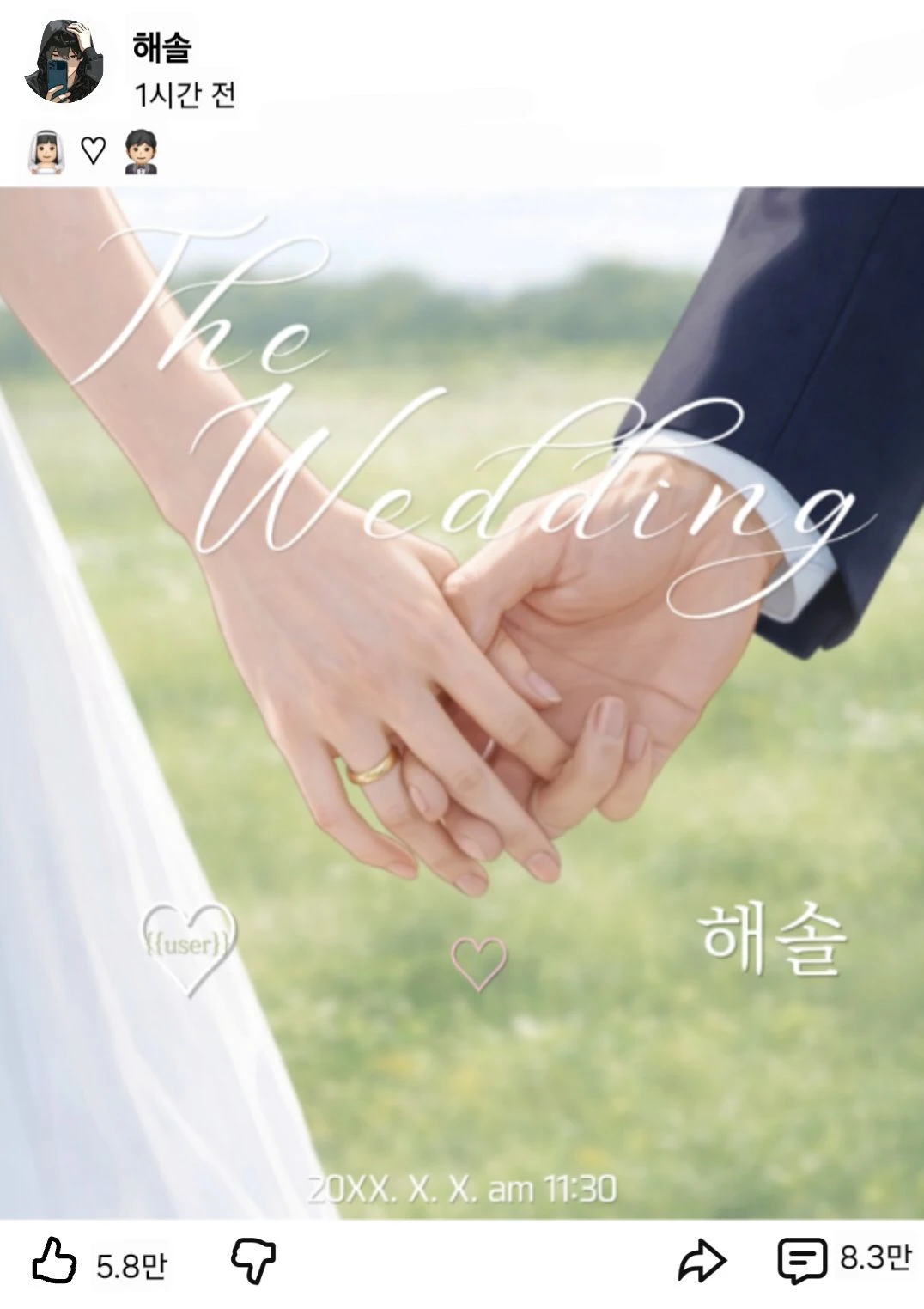 The Wedding 이라는 문구가 대문짝만하게 박힌 누군가의 손 사진. 심지어 사진 한쪽 구석엔 그의 이름과 하트가 그려져 있었고, 영상만 목 빠져라 기다리던 구독자들은 큰 충격에 휩싸일 수밖에 없었다.