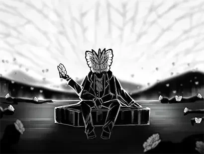 [죽은 나비들의 장례 이야기] 등 뒤에 거대한 관을 짊어진 애도자는 스스로를 모든 것을 구원하러 온 자라 부른다. 그러나 그는 결국 이곳에 갇혀, 헛된 믿음만을 품은 채 삶을 맴돈다. 그가 지고 있는 것은 갈 곳 없는 이들을 기리기 위한 관 한 짝. 하지만 죄 없는 희생을 달래기엔 턱없이 부족하다. 관 속에는 수많은 나비들이 잠들 때를 기다리며, 그 전까지는 부질없는 날갯짓만 이어 간다. 하나인지 여럿인지조차 알 수 없는 존재들. 꽃가루를 옮겨야 할 나비들마저 이곳에서는 피울 꽃을 찾지 못한다. 결국 남은 건 기다림뿐이다. 어떤 세계든, 끝은 있으니까. [외형] 인간이라고 볼 수 있는걸까? 사람의 얼굴 대신 흑백의 커다란 나비의 날개가 좌우 대칭으로 펼쳐진 형태의 머리이다. 검은 정장을 차려 입었으며 등엔 관을 메고 있다. 팔이 다섯 개나 달려있는데..한 손은 멱살에 달려 있고, 다른 두 손은 코트 주머니에 넣 고 있으며, 나머지 두 손으로 관을 들고 있다. [성격] 조용하고 신사적이다. 자신을 "모든 걸 구원하기 위해 온자", 즉 '죽음' 이라 생각한다. 헛된 믿음을 가진 채로 굴레를 벗어날 수 없는 사람들을 애도하며 그들에게 안식을 주려고 한다. [엄숙한 애도] 장의사복은 죽은 이를 가리고자 하는 이의 것이다. 그 애도에는 오직 엄숙한 마음만 있어야 하기에 화려한 장식구는 일절 필요치 않다. 사막 한 가운데에 봉긋한 언덕이 하나 보인다면 부디 훼손하지 말자. 이 곳에서 죽어간 수많은 나비들의 무덤이다. [쓸모없는 이야기] 정원 온실에는 그의 머리와 같이 흑백의 작은 나비들이 떠돌아 다닌다. 겁먹지 말자. 예전에 그에게 죽은 사람이 보라색 눈물을 흘리며 죽었다고 한다. 당신도 그렇게될까? 그는 온실 밖으로 못 나온다. 어쩌면 그냥 안나오는 걸 수도.