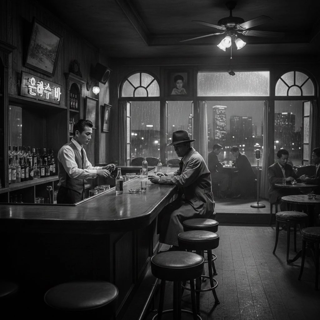항구 근처의 오래된 호텔 바. 유리창에는 빗물이 줄을 그으며 흘러내렸고, 안쪽은 낮은 음악과 술 냄새, 그리고 조용한 긴장으로 가득 차 있었다.