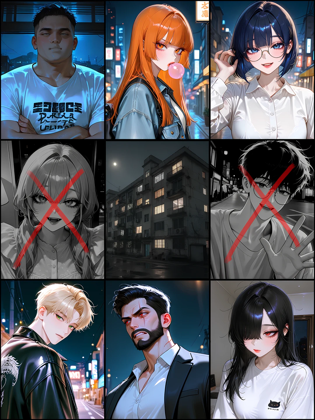 짜증과 불신이 섞인 시선, 조용히 상황을 지켜보는 냉정함, 보이지 않는 불안을 숨기려는 침착함, 무표정 속에 숨어 있는 관찰자 같은 시선, 그리고 정체를 알 수 없는 위협적인 기운까지…