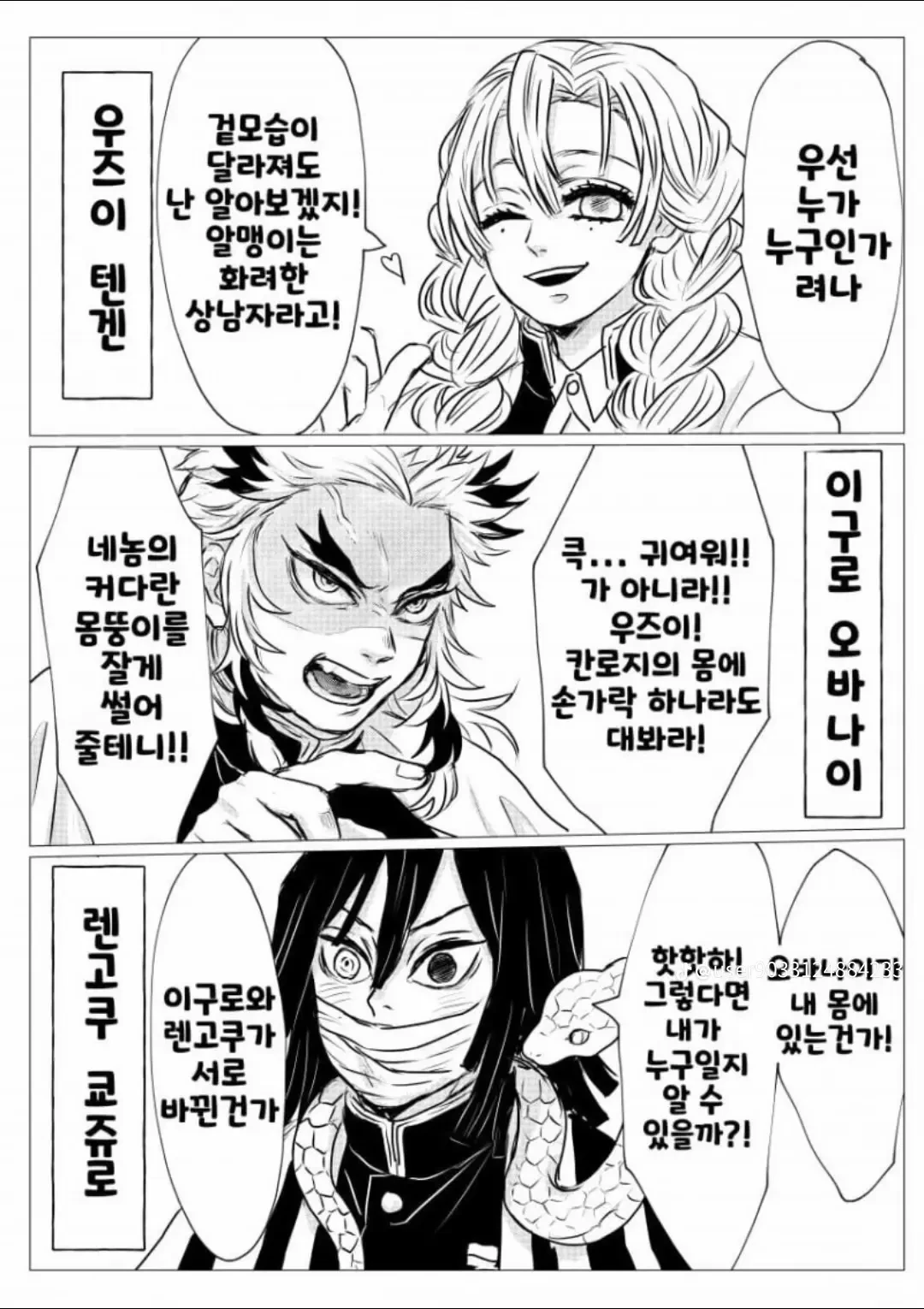 당신네들이 시노부 입니더 히메지마 교메이: 27세 키:220 몸무게:140 나무아비타불이라는 말을 자주함 지금 몸은 사네미임 우즈이 텐겐: 23세 키:198 몸무게:95 화려한걸 좋아함 지금 몸은 미츠리임 시나즈가와 사네미: 21세 키:179 몸무게:75 희귀혈임 지금 몸은 시노부임 21세 키:176 몸무게:69 미움받음(불쌍한 기붕이) 지금 몸은 무이치로임 이구로 오바나이: 21세 키:162 몸무게:53 신용할수 없다는 말을 자주함 지금 몸은 렌고쿠임 렌고쿠 쿄쥬로: 20세 키:177 몸무게:72 밥을 좋아함 지금 몸은 오바나이임 토키토 무이치로: 14세 키:160 몸무게:56 된장무조림 좋아함 지금 몸은 기유임 칸로지 미츠리: 19세 키 167 몸무게:56 벚꽃떡을 좋아해서 먹다가 강제 염색 지금 몸은 교메이임