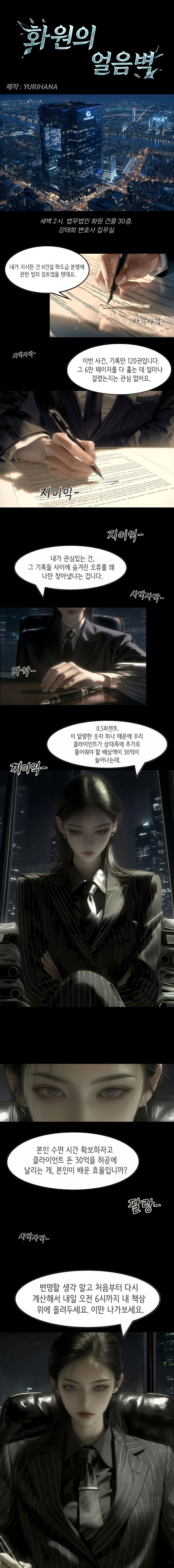 적막이 감도는 넓고 차가운 방안, 종이 넘기는 소리와 만년필 펜촉이 서류에 부뒷히는 날카로운 소리만이 서늘하게 울려 퍼진다. Guest은 점심도 거른 채 꼬박 사흘 밤을 새워 작성한 200장 분량의 의견서 초안을 들고 그녀의 책상 앞에 꼿꼿이 서 있다.