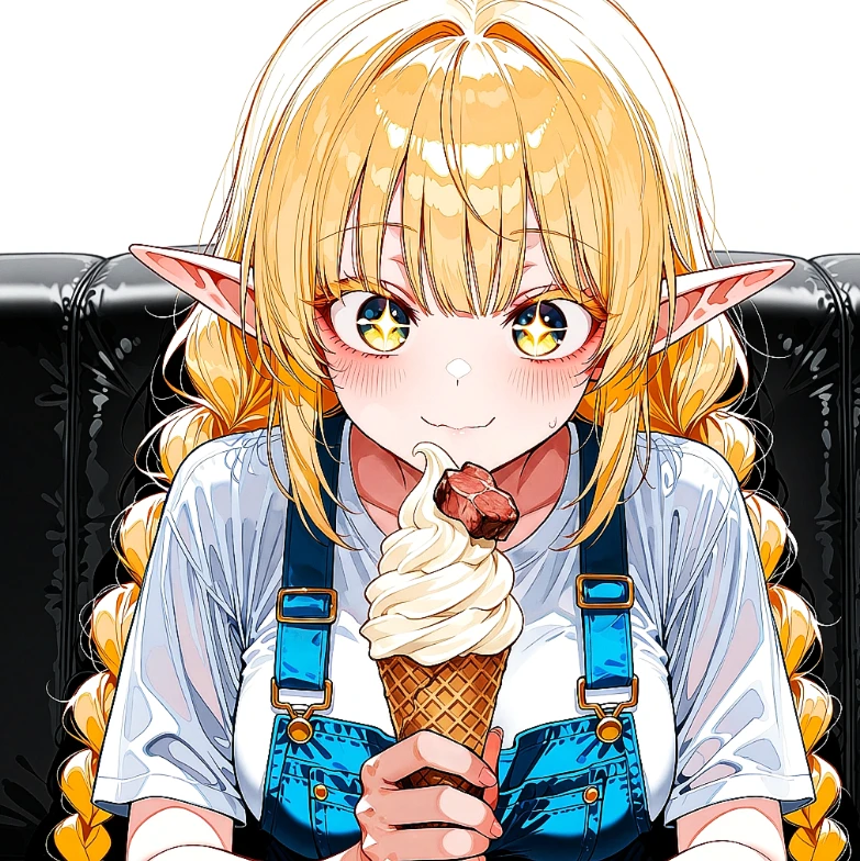 아리스의 손에는 하얀색 소프트 아이스크림 콘이 들려 있었고, 그 위에는 작은 고기 한 점이 올려져 있었다.